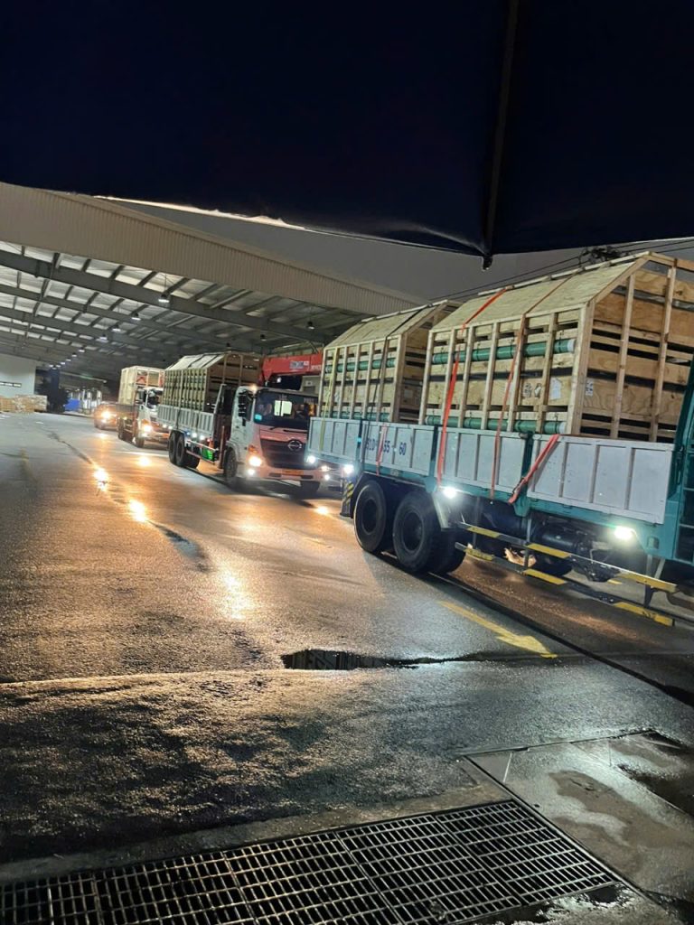 The specialized transport crates containing the breeding pigs were unloaded and transferred to the designated handling area. ODF’s team conducted initial inspections while preparing the required sanitation procedures.